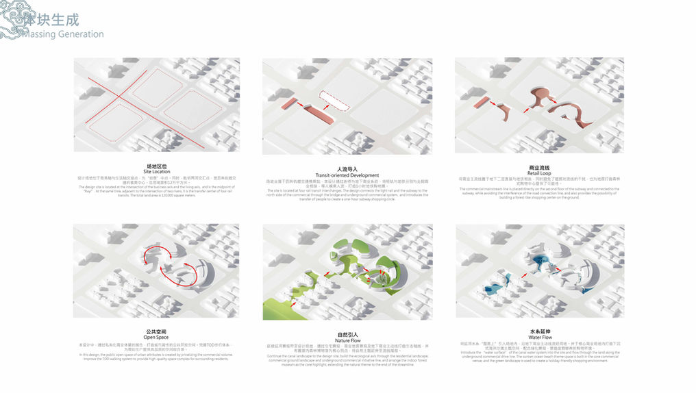 The site located in Longhu North financial centre, which positioned as a international transportation hub. This area was planned to provide ultra-high end landmark retail for Zhengzhou city. The site located where 2 canals connect together and an important intersection of metro and light rail. The development is to provide a mixed-use development with various experience and a waterfront lifestyle center in this business center. It is a development combining transit, culture service and natural landscape.